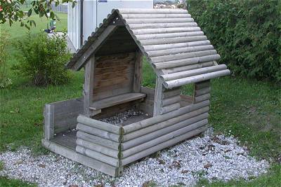 (7) Kinderhaus Das bei unserem ersten Besuch vorgefundene lose Brett am Dach wurde lobenswerterweise in der Zwischenzeit samt den herausstehenden Schrauben entfernt. Ein Sitzbrett ist allerdings noch immer locker, eine Verletzungsgefahr dürfte dadurch aber kaum gegeben sein. |